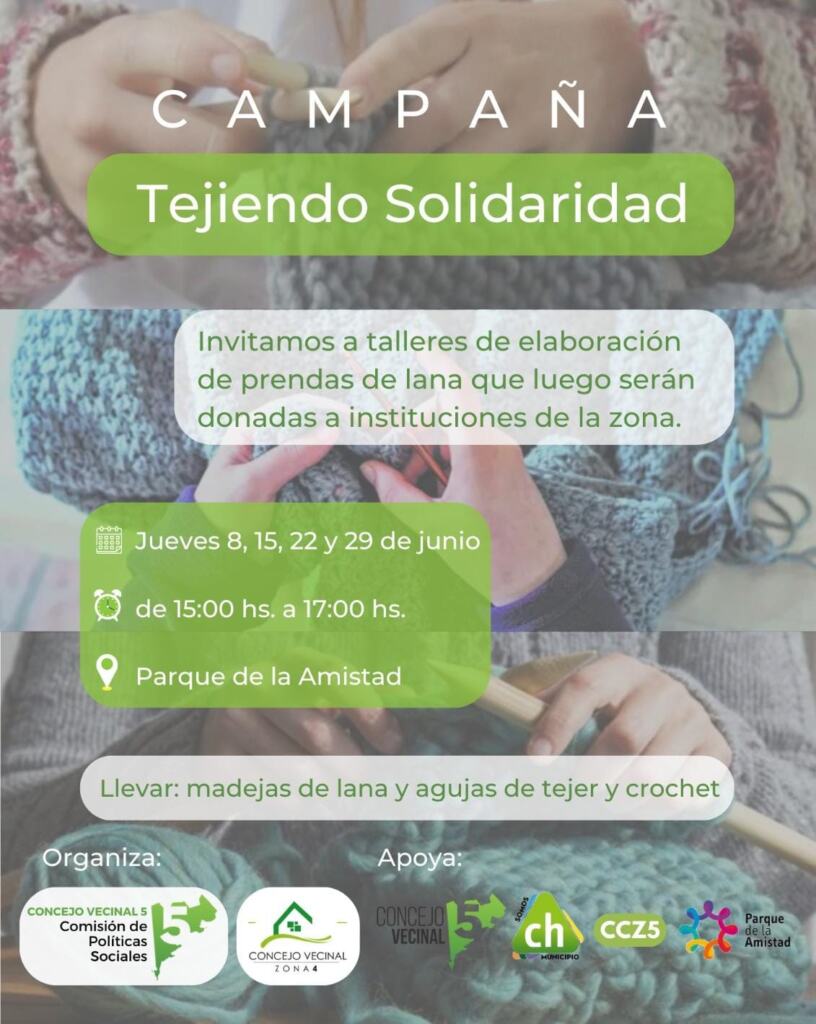 Los jueves días 8, 15, 22 y 29 de junio, la Comisión de Políticas Sociales del Concejo Vecinal convoca la campaña «Tejiendo Solidaridad», cuyos detalles figuran en la imagen, y que tendrá su marco en el Parque de la Amistad, junto a nuestro barrio.